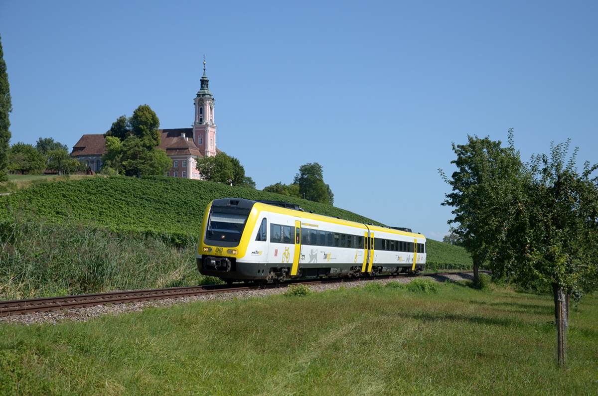 Die Wallfahrtskirche Birnau zwischen Nußdorf und Uhldingen-Mühlhofen wird von einem Regionalexpress nach Basel passiert.
