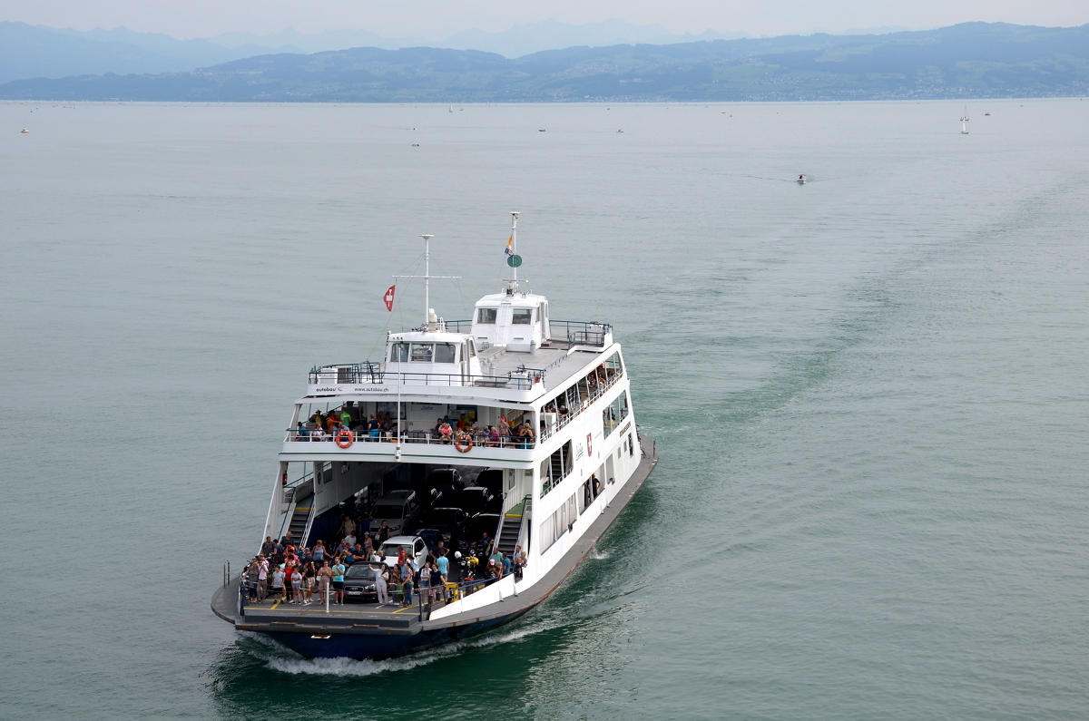Aus Romanshorn kommend fährt die Autofähre "Romanshorn" in den Friedrichshafener Hafen ein.