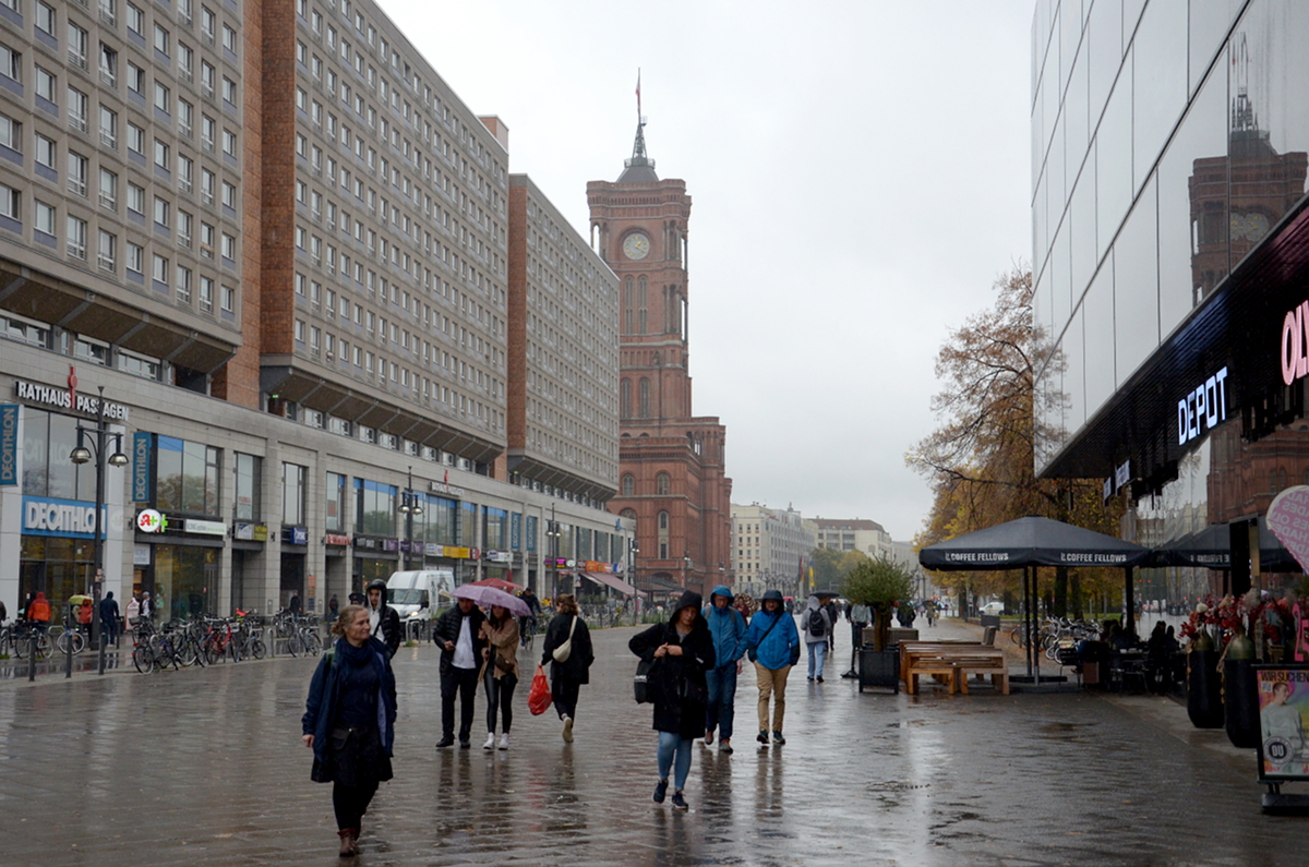 Rathausstraße mit den RathausPassagen (links) und dem Roten Rathaus