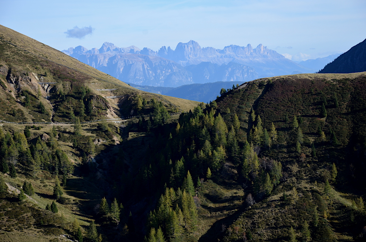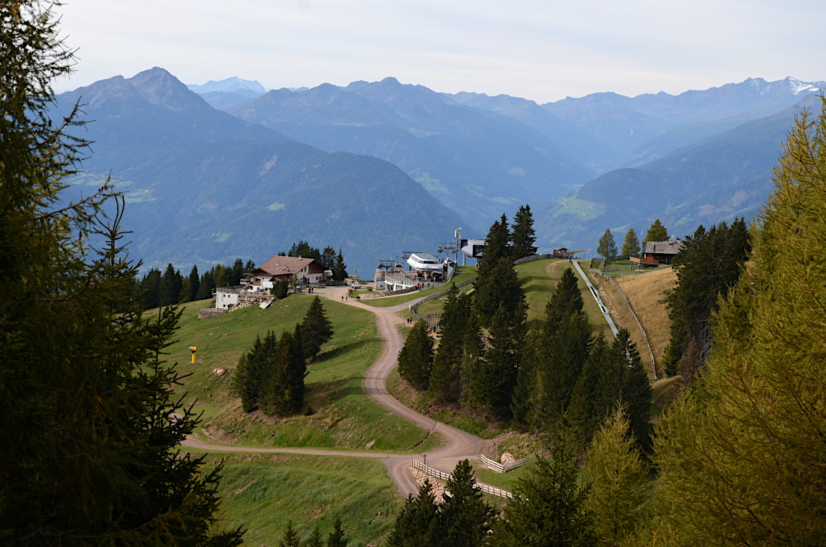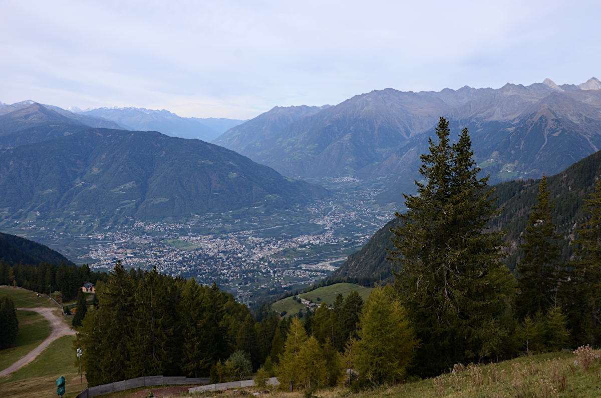 Blick vom Waidmannweg auf Meran 2000 zu den Dolomiten