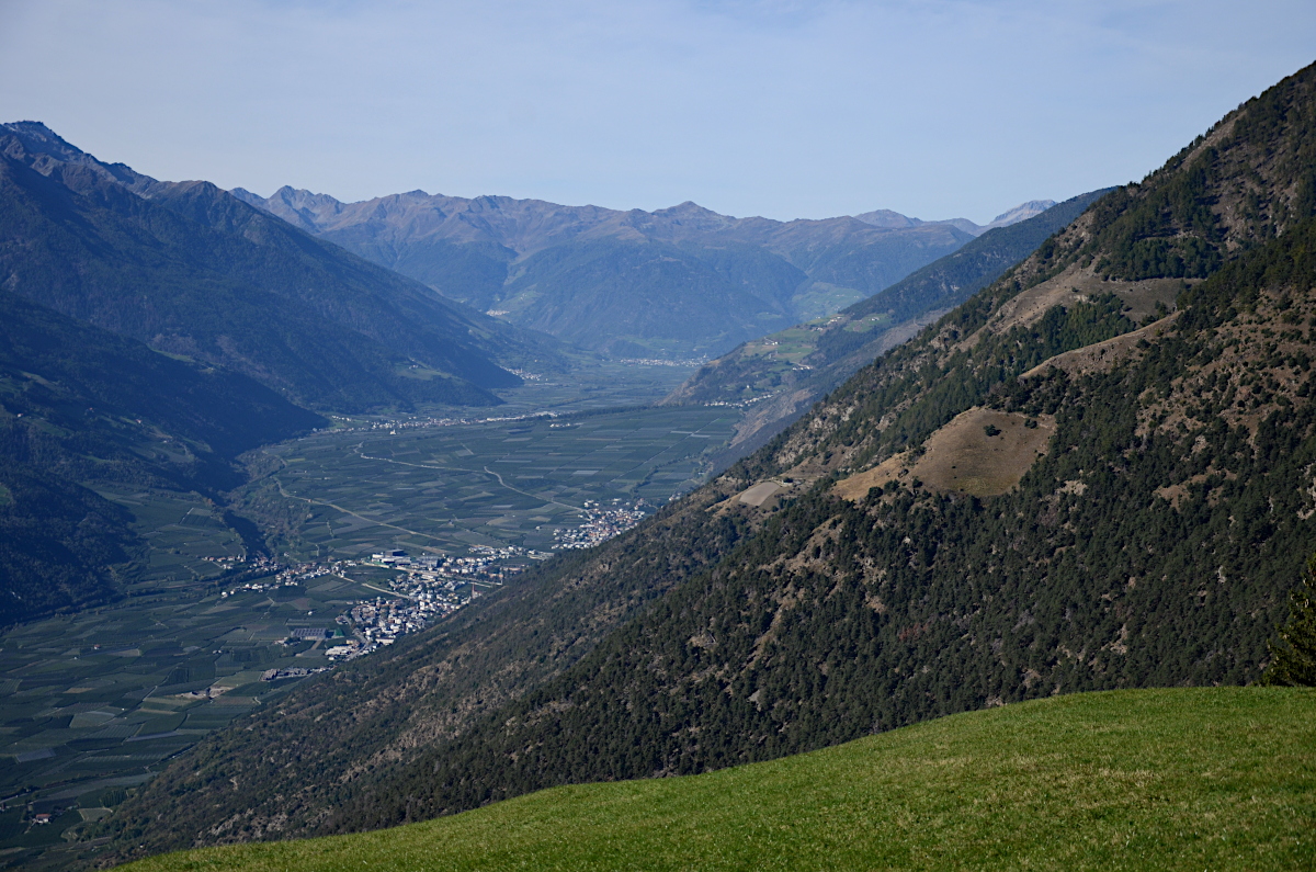Auf dem Vinschger Höhenweg: Blick von Patsch über Latsch und Tarsch im Etschtal