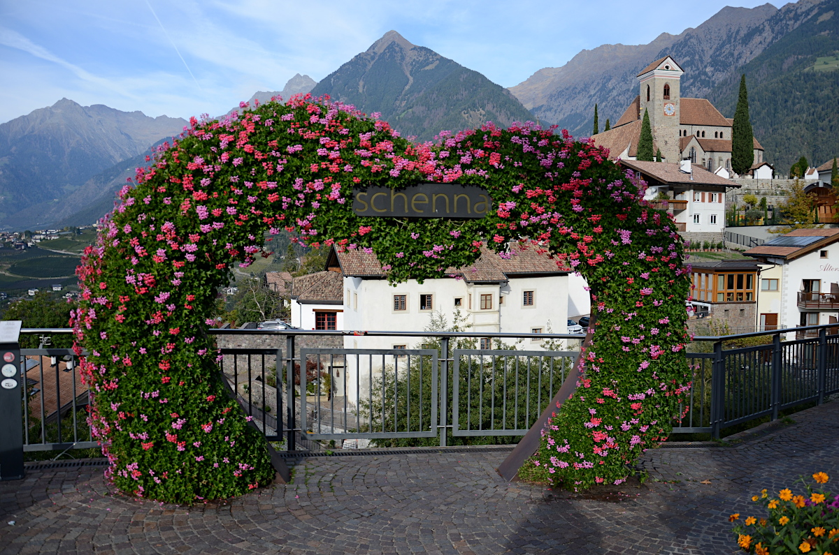 Blumenherz Schenna mit Pfarrkirche Maria Himmelfahrt